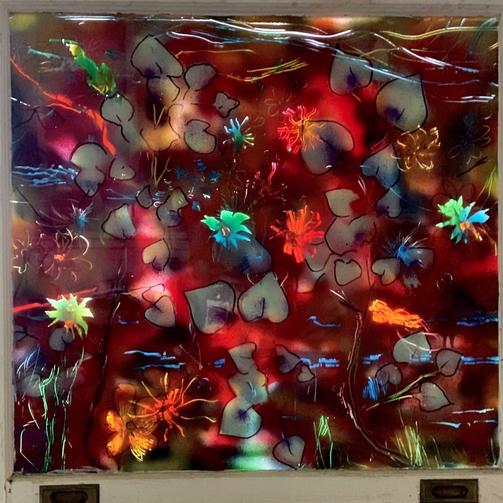 Created by Memphis-based artist RVA246, this colorful abstract floral composition is painted on reclaimed glass using acrylic and enamel in reverse. The original antique window frame adds a rustic charm and depth, making this piece as much an architectural statement as it is fine art.