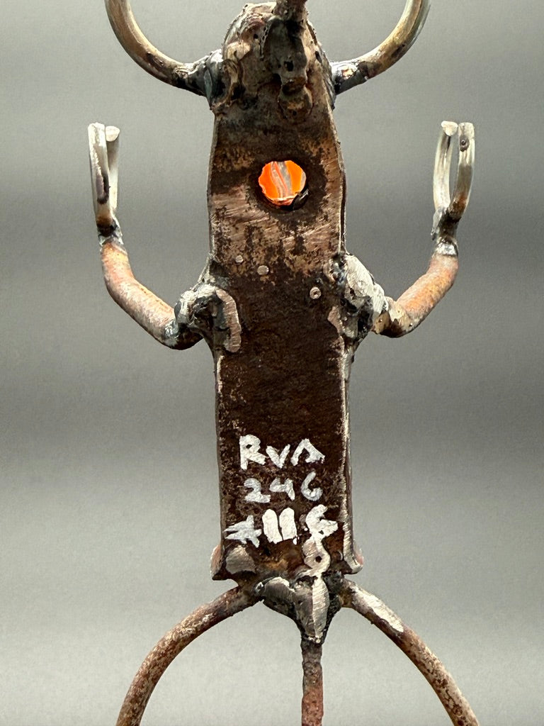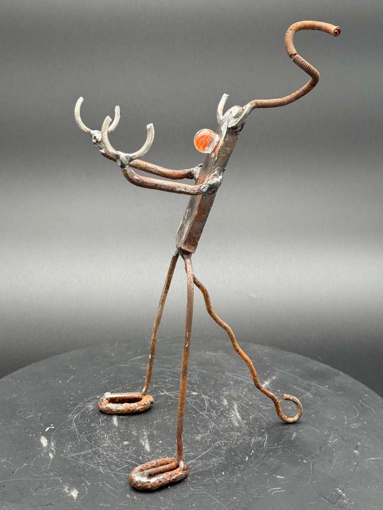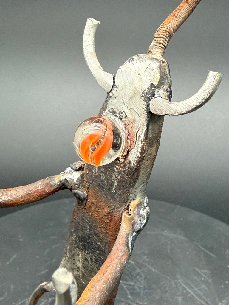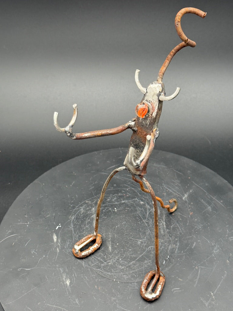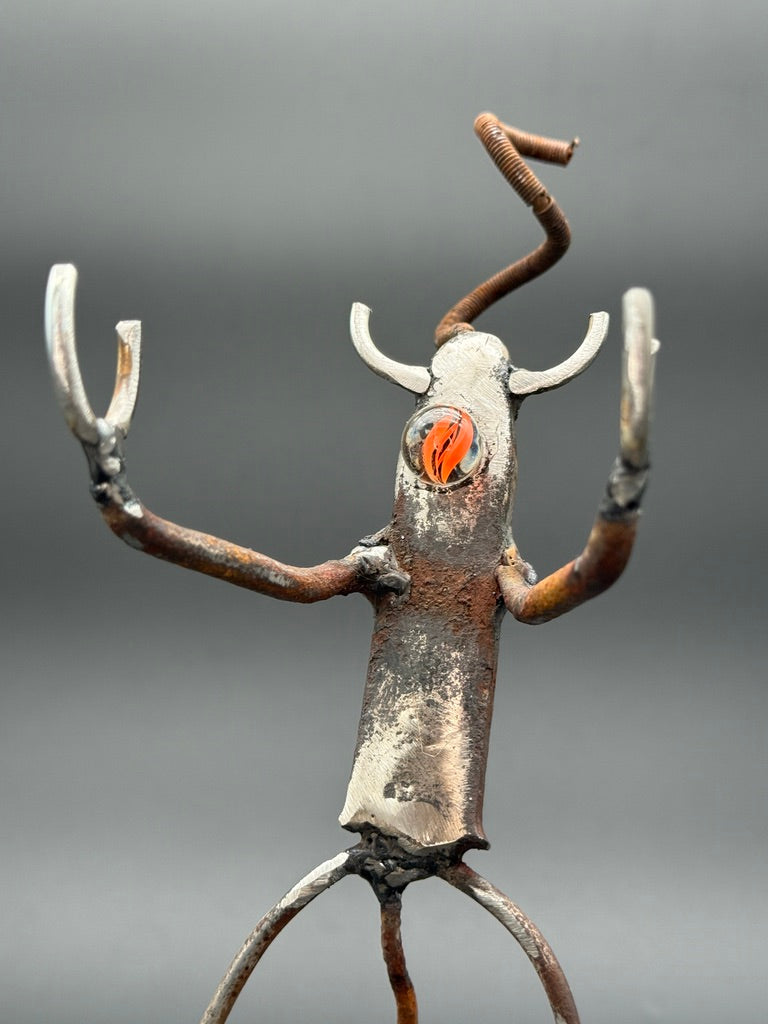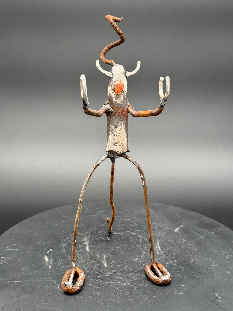 Helper Bot #116 is all gesture. Its stance leans forward with intent, hands open and eager to serve. The long, springy legs and asymmetrical feet give it a playful sense of movement, even while standing still. Subtle textures from aged metal and weld marks celebrate the history of the materials and the honesty of the build.