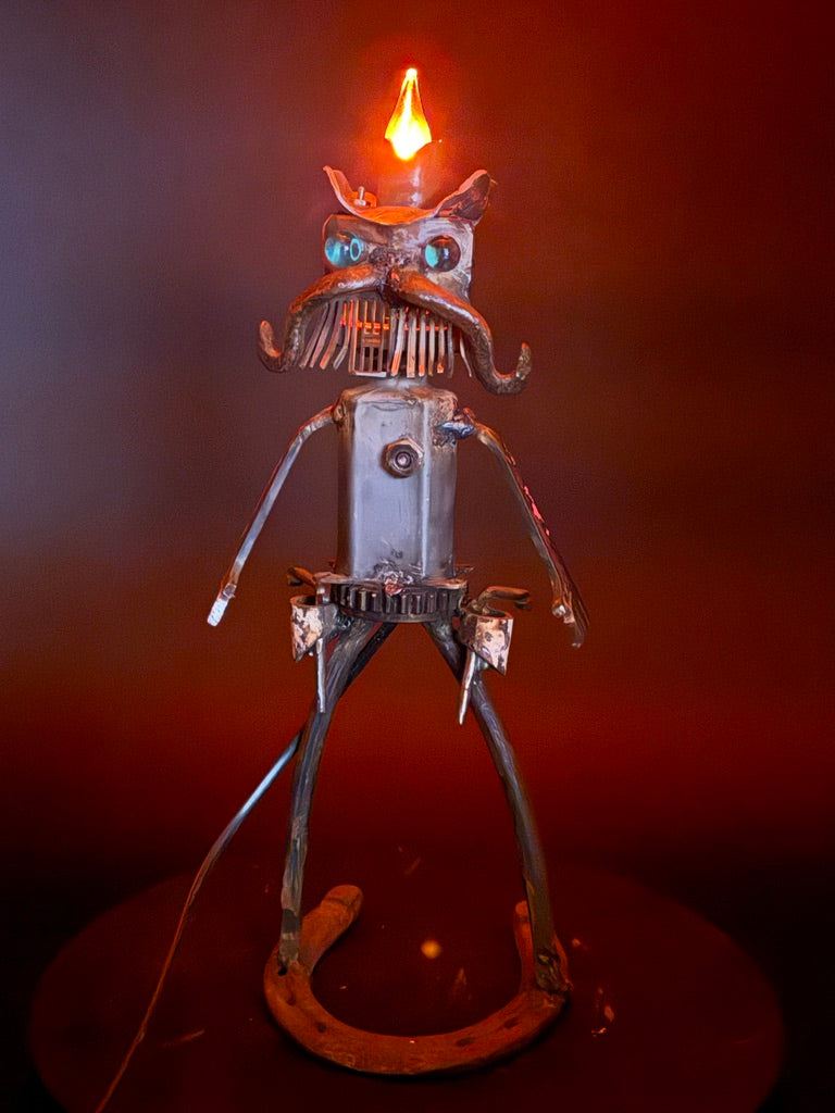 Meet Lawman, an old-school sheriff forged from scrap metal and sworn to keep the peace. This one-of-a-kind robot art lamp channels frontier grit and quiet authority, standing firm with two six-shooters at his sides, a horseshoe base beneath his boots, and a candelabra flame glowing atop his hat. He is watchful, steady, and unmistakably on duty.